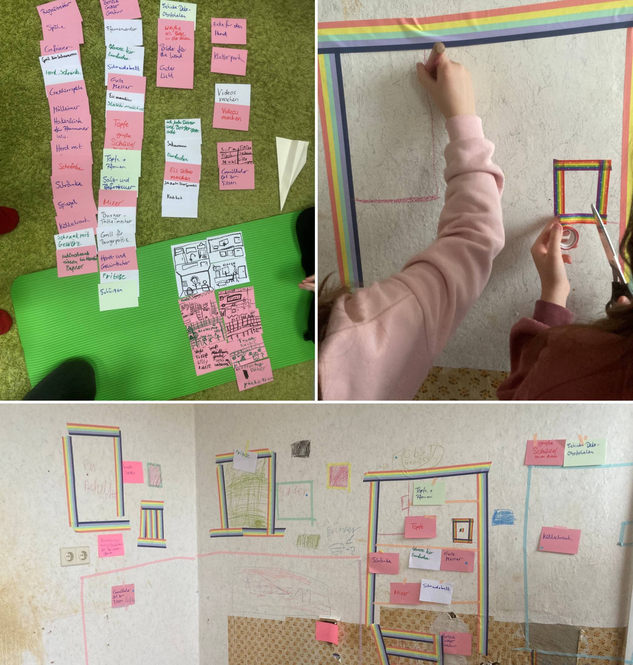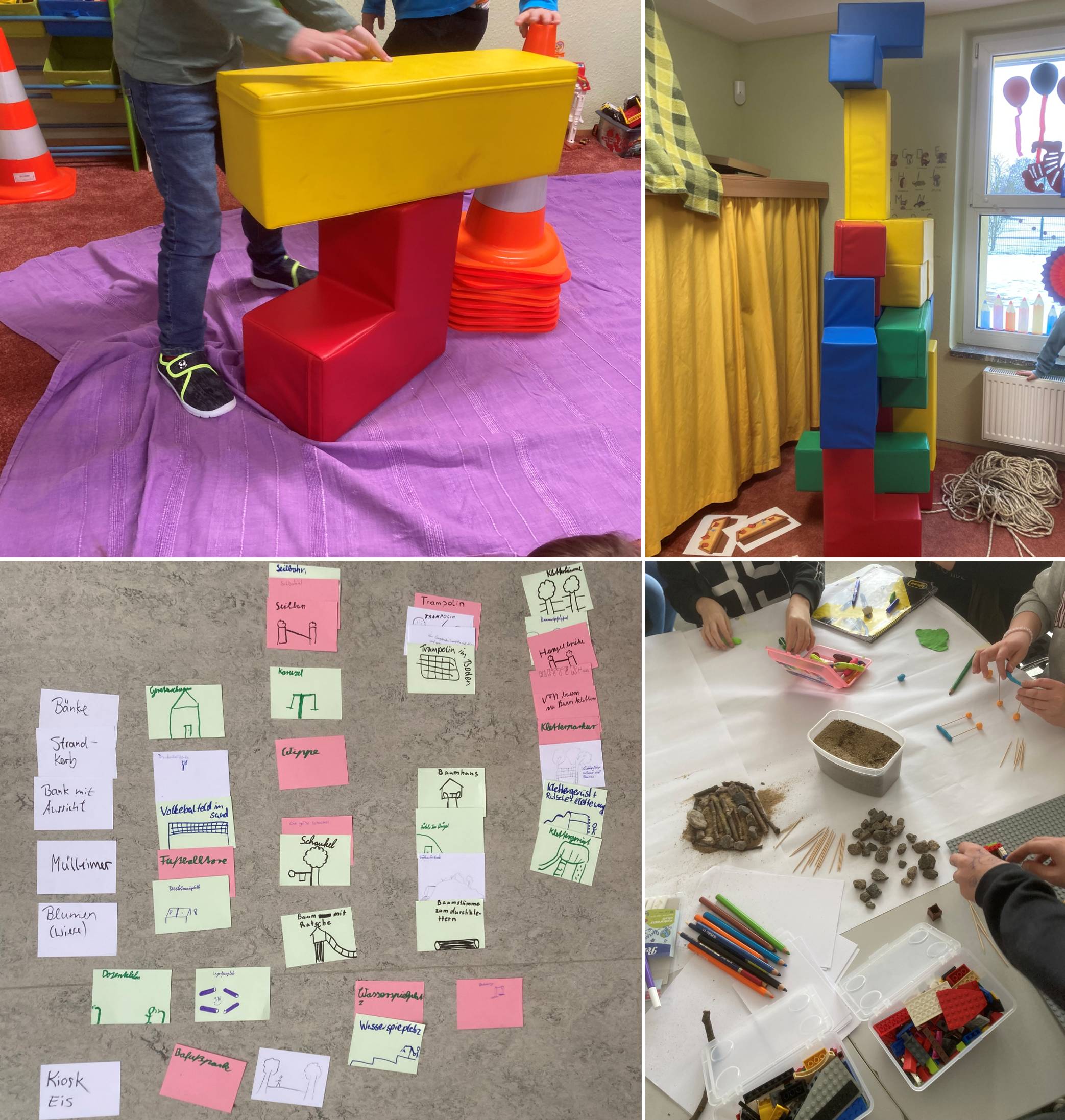 Beide Beteiligungsprozesse waren ein großer Erfolg. Die jüngsten durften mit großen Steinen, Seilen, Decken und weiteren Materialien im Außenbereich aufbauen, wie ein Spielplatz für sie aussehen sollte, welche Aspekte ihnen dabei wichtig sind. Die größeren durften mit Lego, Knete, Papier und Stiften und teilweise sogar mit natürlichen Kleinmaterialien wie Steinen, Sand, Erde, Stöckern, Blättern und Kastanien darstellen, welche kleineren Elemente im Außengelände für sie eine gewinnbringende Gestaltung ausmachen und ihre Elemente direkt in den Plänen platzieren. Die Jugendlichen haben anhand von Diskussionen und kleinen Planspielen über eine Budgetierung anhand von Punkten gearbeitet und dadurch die eventuellen Kosten verschiedener Vorschläge in ihre Priorisierung einbezogen.