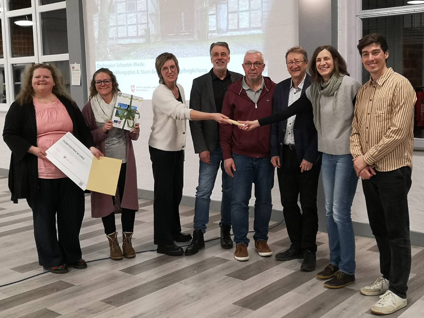 Den Staffelstab übernimmt Silke Keihe von Petra Bammann Projektleiterin der CIMA. Die CIMA hatte in den letzten zwei Jahren mit den Arbeitsgruppen vor Ort einen umfangreiche Dorfentwicklungsplan erarbeitet, für den Michaela Götze vom Amt für regionale Landesentwicklung Braunschweig die Anerkennungsurkunde mitgebracht hatte.